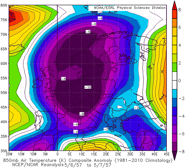 Attendendo il brusco raffreddamento dei prossimi giorni, bisogna però tornare indietro di diversi decenni per ritrovare ondate di freddo e neve simil-invernali particolarmente significative. Le cronache del passato ci riportano locali nevicate fino in pianura sulla Romagna il 6 maggio 1963, ma fu davvero notevole anche l’evento del maggio 1957, quando una straordinata ondata tardiva vide una lingua gelida da -35°C a 500 hPa spingersi fin sulle Alpi, mentre all’altezza di 850 hPa ci fu addirittura la 0°C capace di penetrare fino in Sicilia: il 7 Maggio nevicò in collina su alcune zone appenniniche e si registrarono temperature molto rigide, come i -0.8°C di Milano Malpensa ed i +1°C a Firenze. E alla stazione di Pian Rosà si sarebbe scesi fino a -22,4°C, valore di freddo da considerarsi record italiano assoluto per maggio.