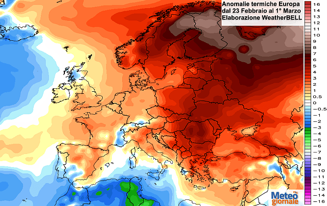 Lo si evince dalla mappa in basso che, analogamente a quanto avvenuto nella settimana precedente, mostra come le anomalie più marcate, con caldo esagerato rispetto alla norma, si concentrano proprio alle alte latitudini. Per le aree scandinave e la Russia Settentrionale è stato un finale d’inverno eccezionalmente mite, con scarti spropositati dalla media anche d’oltre 10 gradi.