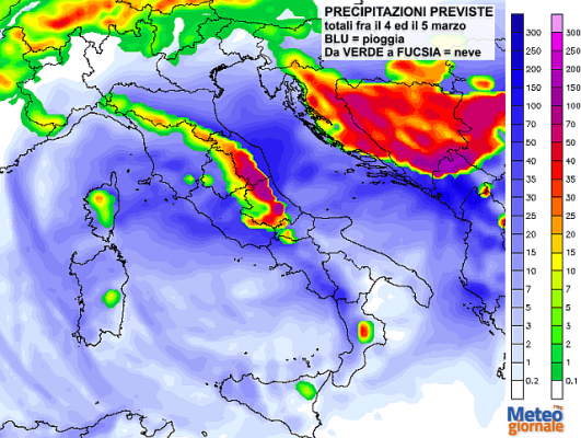 La mappa in basso mostra gli accumuli di precipitazione (in grande evidenza le nevicate, con i colori dal verde al viola) attesi in 24 ore fra mercoledì sera e le ore centrali di giovedì: in questo frangente la neve sarà molto copiosa lungo la dorsale centro-settentrionale appenninica ove i fiocchi potranno sconfinare fino a quote basse collinari. Nevicate sono attese anche sui maggiori rilievi del Sud, dove il freddo maggiore si avvertirà nei giorni successivi.