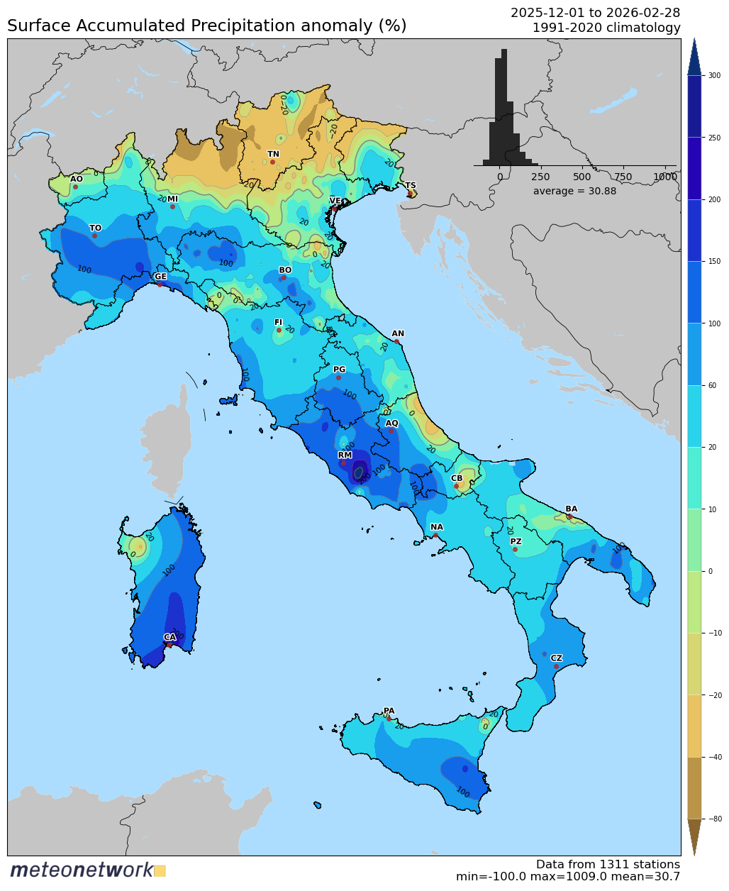 Questo dovuto a ripetute Correnti tese fra WSW e WNW e Minimi di Pressione sul Basso Mediterraneo che hanno favorito il Centro Sud, specie Tirrenico, e meno il Nord (Ligure e Basso Piemonte esclusi).