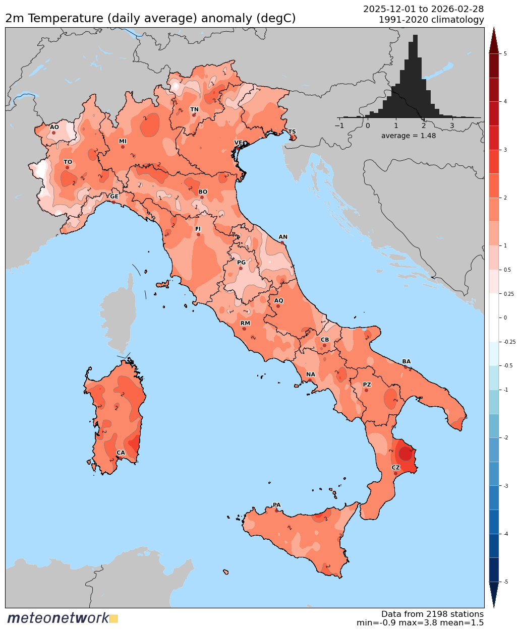 Al di la’ di una certa impressione di Inverno Freddo, dovuta a molti giorni di Pioggia e cieli grigi e del periodo dell’Epifania, i Dati Reali ci dicono che e’ stato un Inverno tutt’altro che freddo! Ben +1.48 C sopra la Media 91-20!