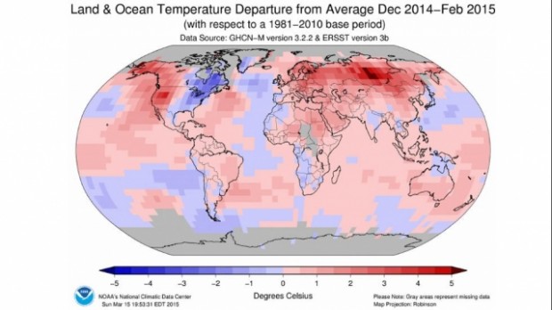 I dati NOAA del trimestre dicembre-febbraio, ovviamente per quel che concerne l’emisfero settentrionale, ci dicono che la temperatura globale combinata (superficie terrestre e superfici oceaniche) è risultata superiore di 0,79°C rispetto alla media del 20° secolo. Ciò vuol dire che l’inverno 2014-2015 si colloca in cima alla lista degli inverni più caldi, scalzando dal trono il 2007.