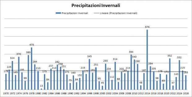 Allora, non avendo dati precisi in generale, ho preso i miei Dati (*) registrati dal 1970 tramite un Pluviometro Manuale, ed ho fatto un Grafico in cui sulle Ascisse ho messo l’Anno di Inverno Meteorologico ( Es. Inverno 2002 = Dicembre 2001 + Gennaio 2002 + Febbraio 2002) e nelle Ordinate i Litri/Metro Quadro di Acqua caduti (Pioggia + Neve Sciolta). (Media Aritmetica 170.5 l/mq)