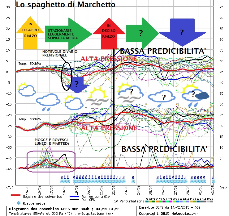 Febbraio ,come spesso ci ha abituato è il mese per eccellenza dell’inverno,sopratutto sulla costa adriatica ed anche quest’anno,rispetto allo scorso si è fatto almeno fino ad ora valere.Certo,non è stato crudo come altre annate,ma molto meglio dello scorso,così come in generale su tutta la stagione.Le nostre piste da sci appenniniche,anche se in ritardo,stanno rendendo felici appassionati ed imprenditori,ma ancora per quanto?Andando a monitorare le uscite dei modelli,si scorge sopratutto due fattori.Il primo è il peggioramento di inizio settimana(lunedì e martedì) con piogge a tratti anche moderate e nevicate sui monti solo sopra i 1000/1200 mt. Il secondo è la rimonta anticiclonica che si dovrebbe concretizzare verso il prossimo weekend con valori termici palesamente sopra media in grado di portare SE CONFERMATI i primi tepori primaverili.Ma in questa uscita del meteogramma da me elaborato si nota anche una insolita indecisione praticamente a breve termine frutto di una presunta retrogressione si una sacca di aria gelida siberiana vista sia da alcune variabili del suddetto modello,ma anche da altri modelli previsionali.Le probabilità che essa interessi la nostra penisola sono assai basse,ma vista la perseveranza di alcune variabili penso sia giusto perlomeno prenderne atto.L’alta pressione dovrebbe perseverare anche nell’ultima settimana di febbraio,quella che poi ci traghetterà verso la primavera meteorologica con inizio il primo Marzo.A presto.
