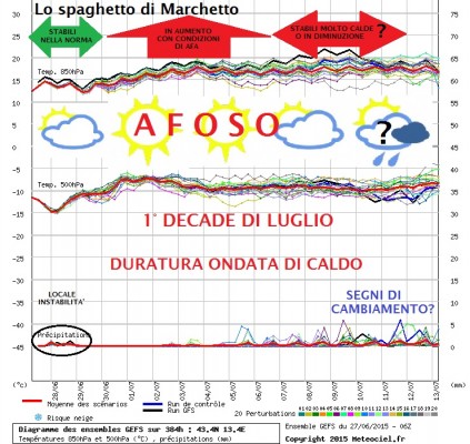 Poco da dire,sarò breve. Sull’Europa centro meridionale si andrà ad instaurare la classica figura di blocco ad omega,garanzia di stabilità,calura ed afa anche di buona durata.Queste configurazioni di solito possono durare anche tra i 10/15 gg.Il perno di tale configurazione al momento sembra oscillare tra la nostra penisola e quella Iberica fino al nord Europa.Poco cambierà nella sua fluttuazione,al più il suo spostamento(fattibile) verso ovest potrebbe favorire in un secondo momento un’aumento de”instabilità pomeridiana,ipotesi da non scartare,ma al momento è più una speranza (mia personale) che un previsione.Prima decade quindi segnata da un’ondata di calore eccellente,ma non eccezionale come alcuni sbandierano tirando in ballo annate buie.Non vi annoio con la sagra dei valori massimi che potremo toccare,cercate più che altro di fare tesoro dell’esperienza e del buon senso per trarne beneficio e non aggravio,da questo periodo di bel tempo comunque estivo.Ci aggiorniamo.