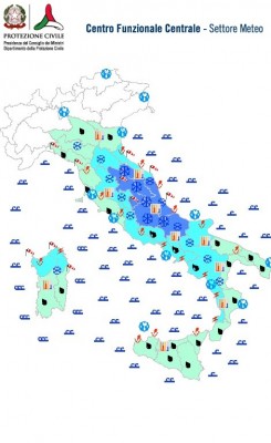 Al Centro-Nord, invece, sempre dalla serata odierna, le precipitazioni saranno a carattere nevoso, a quote superiori ai 200-300 metri, su Umbria, zone interne del Lazio, Abruzzo e Molise, con accumuli al suolo deboli, da moderati ad abbondanti a quote superiori ai 400-500 metri. Dalla prime ore di domani, infine, si prevedono venti forti meridionali su Puglia e settori ionici di Basilicata e Calabria, con raffiche fino a burrasca forte e possibili mareggiate lungo le coste esposte.