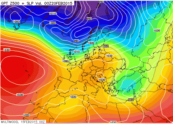 Diamo uno sguardo all’evoluzione meteorologica prevista dalla modellistica numerica per il prossimi giorni. Il prodotto utilizzato è quello medio multimodel ensemble (vedi figura riferita al 20 febbraio). Stante la buona predicibilità generale, sino a martedì 17 si confermano sull’Italia condizioni di tempo molto instabile, a tratti anche perturbato, nevoso in montagna e piovoso altrove, comunque non freddo per la stagione.