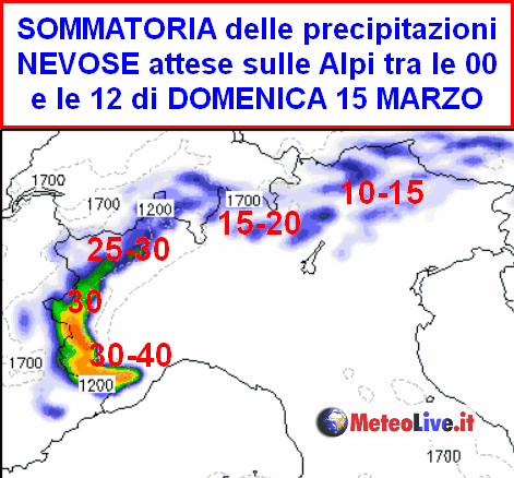 La prima cartina ci mostra gli accumuli previsti sulle Alpi tra le 00 e le 12 di domenica 15 marzo. I valori più elevati, fino a 30-40 cm, si prevedono tra le Alpi Marittime e Cozie. Buoni gli accumuli anche tra la parte orientale della Val d’Aosta (Valle del Lys), la Val Sesia e l’Ossola in Piemonte. Più scarsi gli accumuli procedendo verso levante.