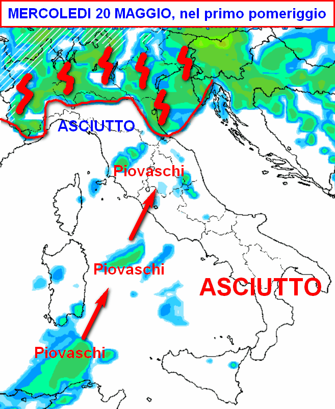 La cartina che vedete si riferisce al primo pomeriggio di mercoledì 20 maggio. Risulta palese l’interessamento del nord Italia da parte di manifestazioni temporalesche talora intense, che si muoveranno da ovest verso est sfruttando il letto di correnti occidentali alle quote superiori.