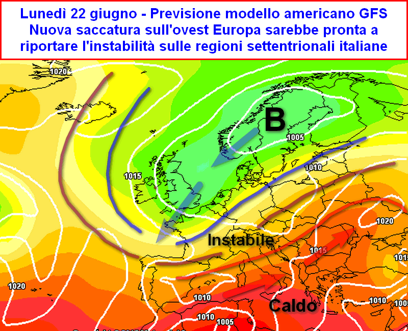 L’anticiclone non sembrerebbe in grado di mantenere il proprio dominio sulle regioni del nord. Questo settore d’Italia diverrebbe interessato da un nuovo aumento dell’instabilità già con l’inizio della settimana successiva (lunedì 22). Aria fresca/fredda di origine nord-atlantica tenderebbe infatti a scavare una nuova saccatura sull’Europa occidentale, determinando la rotazione dei venti dai quadranti sud-occidentali. L’instabilità sarebbe pronta a farsi strada inizialmente sui settori alpini e prealpini (lunedì 22), poi anche sulle zone pianeggianti (martedì 23 – giovedì 24).