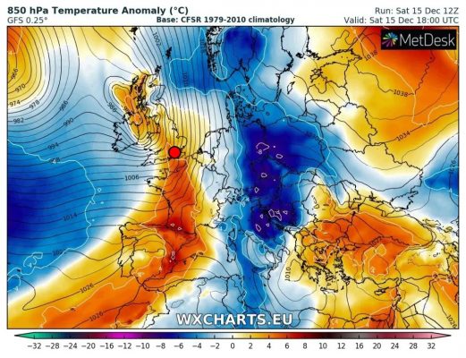 Vi mostro la anomalia della temperatura alla quota di 850 hpa quindi a circa 1450 metri sul livello del mare previste per le prossime ore(prima immagine) e per la vigilia di Natale(seconda immagine).