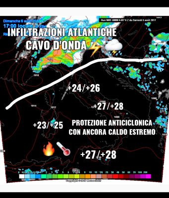 Attenzione nella giornata di domani! Un rapido ma intenso passaggio instabile Atlantico attraverserà nel verso senso della parola le nostre regioni settentrionali grazie ad un “Cavo d’onda” o “linea di instabilità”. Ora voi mi direste cosa vogliono significare questi due termini, ed eccovi qui la spiegazione! Queste due parole stanno a significare la presenza di un fronte (in quota) che modifica il grado di stabilità della colonna d’aria rendendola instabile. Nella maggior parte dei casi sono appartenenti ad un asse di una saccatura ed infatti lo sono anche in questo caso dato che provengo dalla saccatura presente a nord dell’ Inghilterra e dell’Irlanda. Questo “Cavo d’onda si posizionerà proprio sul settore Alpino e nelle regioni settentrionali. La situzione però sarà ben diversa al centro-sud ove si faranno ancora i conti con il caldo estremo.