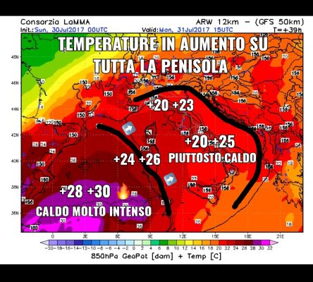 Un’ulteriore forte rialzo subiranno le temperature nella giornata di domani con picchi di 38-39° in Emilia Romagna, specie in quella centro-orientale e nel resto del settentrione non si andrà oltre i 34-35°C che registreremo soprattutto tra Piemonte e Lombardia. Nelle regioni centrali si potranno toccare già i 40°C specie nei settori interni laziali, 37-38°C nelle zone interne toscane, più fresco solo in Abruzzo con punte di 34-35°C specie nell’immediato entro terra. Per quanto riguarda le regioni meridionali i valori toccheranno i 36-37 e anche 38°C sul Tavoliere delle Puglie, in Basilicata, nei settori ionici calabresi e sulla piana di Catania, in Sicilia. Attenzione in Sardegna ove i 40°C potrannno interessare tutta la zone occidentale a regione. Temperature minime in rialzo ovunque con tassi di umidità piuttosto elevati speciene nei settori costieri.