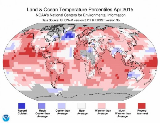 Le ultime notizie dalla NOAA confermano la netta tendenza alla crescita della temperatura globale: il mese di aprile infatti è risultato a livello globale più caldo di 0,74 °C rispetto alla media del ventesimo secolo e si è classificato al 4° posto tra i mesi di aprile più caldi della serie storica che risale al 1880 ! Di conseguenza il primo quadrimestre del 2015 risulta il più caldo in assoluto tra gli ultimi 136 anni con un’anomalia di ben +0,80 °C rispetto alla media del XX° secolo!