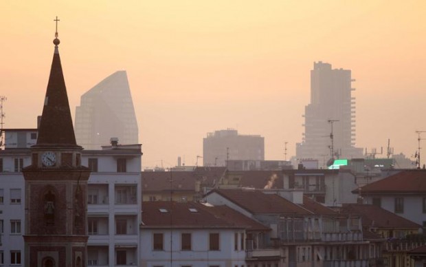 An aerial view of skyscrapers area of Milan, Italy, as it is surrounded by smog  on 26 December 2015.  The city of Milan has announced that it will not allow private vehicles to circulate in Italy's business capital for three days next week in an attempt to bring down pollution levels that have been above the legal limit for some time. ANSA/STEFANO PORTA