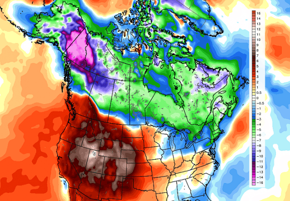 Al contrario in Canada dominano le anomalie fredde, nello Yukon si raggiungono i 15 gradi sotto la norma. In controtendenza solo il centro-sud della British Columbia e l’estremo sud di Alberta e Saskatchewan.