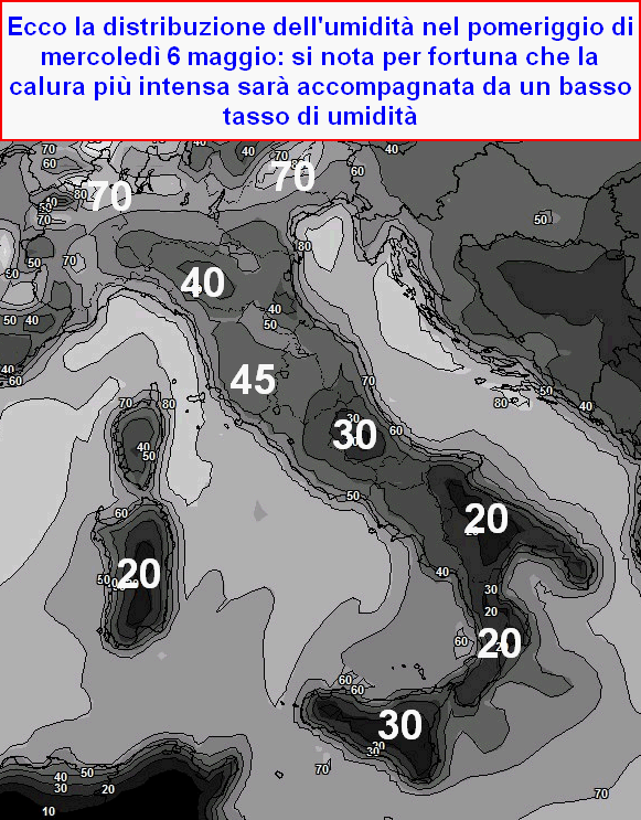 L’osservazione della mappa qui a fianco conforterà chi vive nelle zone interne sarde, pugliesi o siciliane: le temperature elevate attese tra martedì e giovedì della prossima settimana su queste zone saranno accompagnate da un tasso di umidità molto basso.
