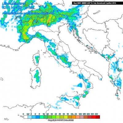 Questa mappa si riferisce alle precipitazioni dovute a rovesci e temporali che si verificheranno fra il pomeriggio di oggi e la notte tra domenica e lunedì. Come si vede, tutto l’arco alpino, le Prealpi e l’Appennino settentrionale saranno interessati da fenomeni, di varia durata e intensità (da pochi minuti a un paio d’ore), alcuni anche di forte intensità accompagnati da raffiche di vento e da isolate grandinate. I fenomeni si spingeranno sia oggi che domenica a livello sparso anche al novarese, basso varesotto, milanese e Brianza, mentre saranno più locali nella serata di domani. Gli orari di inizio andrannno a partire dalle 16/17 sui rilievi, verso le 18/19 in pedemontana dalle 20/21 in medio-alta pianura, in esaurimento ovunque entro le ore 02 della notte successiva. Come si vede, fra Piemonte occidentale, Ossola e Orobie e Trentino si avranno localmente anche accumuli prossimi o superiori ai 100 mm nelle prossime sessanta ore. Attenzione dunque per chi programma escursioni, o iniziative all’aperto soprattutto tardo-pomeridiane e serali, pensando che il tempo sia stabile e soleggiato stile deserto.