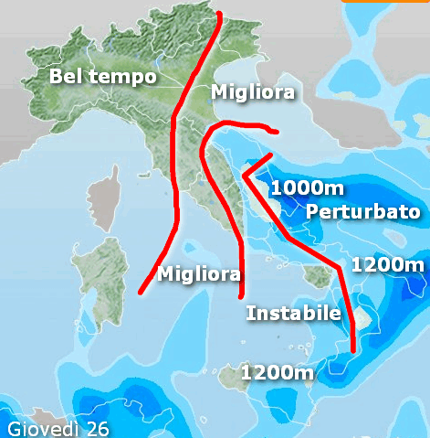 Toscana, Lazio e Sardegna, ancora instabile altrove, con precipitazioni residue, anche temporalesche in mattinata su Calabria ionica, Basilicata e Puglia. In serata il nocciolo duro dei fenomeni si concentrerà tra Abruzzo e Molise, risalendo poi verso le Marche. Altrove fenomeni in via di lenta attenuazione, ma ancora piuttosto frequenti sulla Sicilia tirrenica. Nevicate intorno a 800 metri su Romagna e Marche, tra 1.000 e 1.200 metri su tutte le altre zone. Venti intensi a rotazione ciclonica con perno sulla Calabria tirrenica. Mari meridionali fino ad agitati. Profilo termico pressochè invariato intorno ai valori medi del periodo.