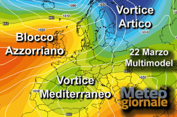 Ma il dinamismo barico tipico della Primavera non darà tregua, e già sabato 21 marzo, proprio in corrispondenza dell’inizio della primavera astronomica, il tempo si guasterà nuovamente. La dinamica è presto spiegata. Come possiamo vedere nella Multimodel a 500 hPa del 22 marzo, il blocco altopressorio azzorriano si spingerà sino alle isole britanniche e alla Scandinavia, favorendo la discesa di aria fredda verso sud-ovest che darà vita ad un vortice mediterraneo tra Spagna e l’Italia.