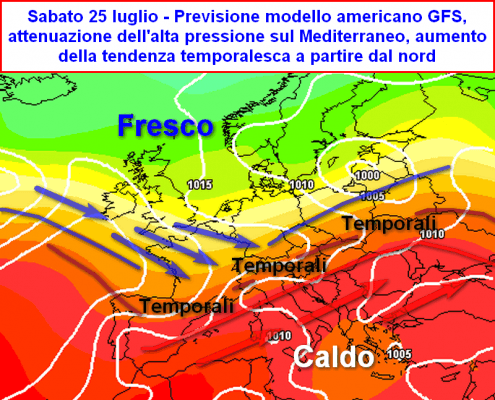 L’arrivo della terza decade di luglio, potrebbe tracciare una nuova linea di tendenza che porterebbe alla graduale attenuazione del campo anticiclonico in sede mediterranea, laddove appare abbastanza probabile l’affievolimento del contributo caldo africano che attualmente tiene ancora in piedi tutta la struttura. Questa manovra potrebbe preparare il terreno al transito di qualche sistema frontale più organizzato entro la fine di luglio.