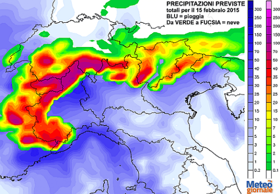 La mappa in basso si riferisce alle precipitazioni attese: in gran risalto i quantitativi nevosi sulle Alpi, che in quota potranno superare gli 80/100 cm nell’arco di appena 24 ore. Le aree più colpite dalle nevicate saranno con ogni probabilità la Valle d’Aosta e l’Alto Piemonte, ma gran neve è atesa anche sulle Alpi Lombarde.