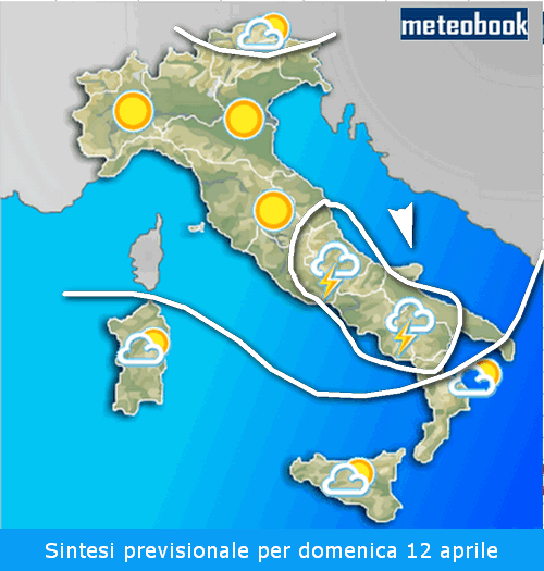previdom12aprDomenica la coda di questa debole perturbazione riuscirà ad infilarsi lungo l’Adriatico e, coadiuvata dalla presenza di una bolla di aria più fresca in quota, potrà dar luogo a qualche rovescio o temporale tra pomeriggio e sera sui settori interni del centro e del sud peninsulare, e precisamente su Lazio, Abruzzo, Molise, Campania e Basilicata.