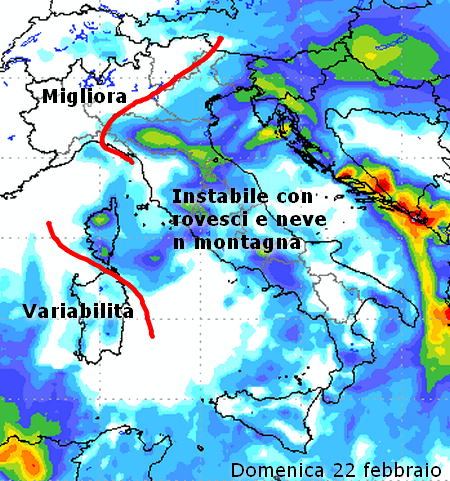 TENDENZA PER DOMENICA: le due perturbazioni, ormai fuse tra loro, daranno vita ad un vortice di bassa pressione a occhiale, con un minimo sulla Tunisia e uno sul Tirreno centrale. Attorno a questa struttura andranno sviluppandosi le bande nuvolose che porteranno ulteriori precipitazioni su bassa Padana, nord-est, centro e meridione. Nevicate tra 800 e 1.000 metri sulle Alpi, 1.000-1.200 metri sull’Appennino settentrionale, 1.400-1.500 metri su quello centrale, 1.500- 1.600 su quello meridionale e in Sicilia. Tendenza a variabilità e a successivo miglioramento su nord-ovest e Sardegna con rotazione del vento dai quadranti settentrionali, ancora Scirocco lungo l’Adriatico, in particolare sul Canale d’Otranto e in Salento. Temperature senza variazioni apprezzabili.