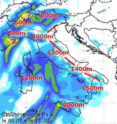 PREVISIONI PER SABATO: al mattino ultime schiarite su Puglia e Calabria Ionica, altrove nuvolosità compatta con tendenza a precipitazioni al nord per la perturbazione atlantica e sulle Isole Maggiori per quella africana. Dal pomeriggio i fenomeni tenderanno ad estendersi a tutto il Paese, anche se lungo l’Adriatico potranno aversi ancora prevalenti momenti asciutti. Possibili temporali in serata sul medio versante tirrenico. Nevicate sulle Alpi tra 500 e 800 metri (oltre che sulla pedemontana cuneese), sull’Appennino centro-settentrionale e in Sardegna tra 1.000 e 1.300 metri, su quello meridionale tra 1.400 e 1.600 metri, oltre i 2.000 metri in Sicilia. Scirocco in rinforzo e mari fino a molto mossi. Temperature massime in calo.